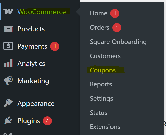 - Go to WooCommerce → Marketing → Coupons